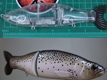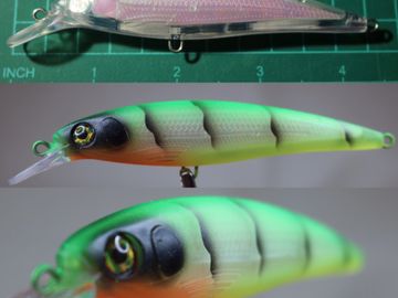 3 1/2” minnow jerkbait with a two tone holographic core. Although full opaque paints can be done, semi transparent sprays are recommended to show the core.